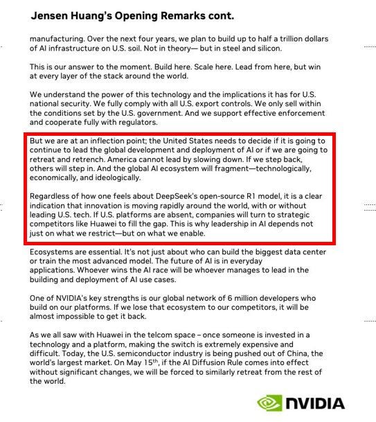 At the same time, there appears to still be considerable pushback on the US government so-called AI Diffusion Framework, set to take effect officially on May 15. The Framework is under review, and its effective date could be pushed out 60 or more days to allow for full review and potential changes that have been proposed.